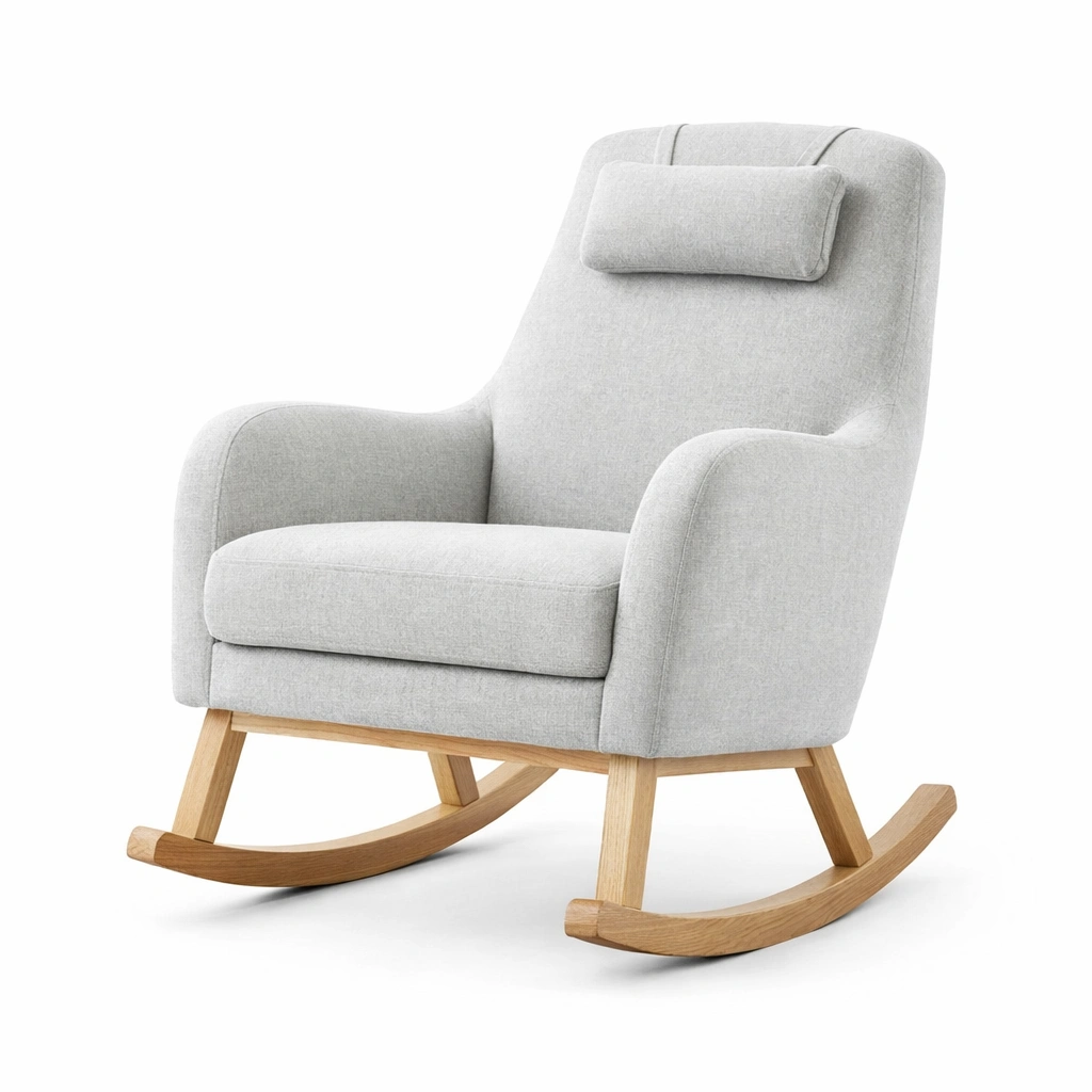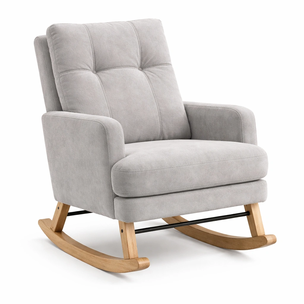 Silla mecedora tapizada en poliéster gris claro con estructura de madera