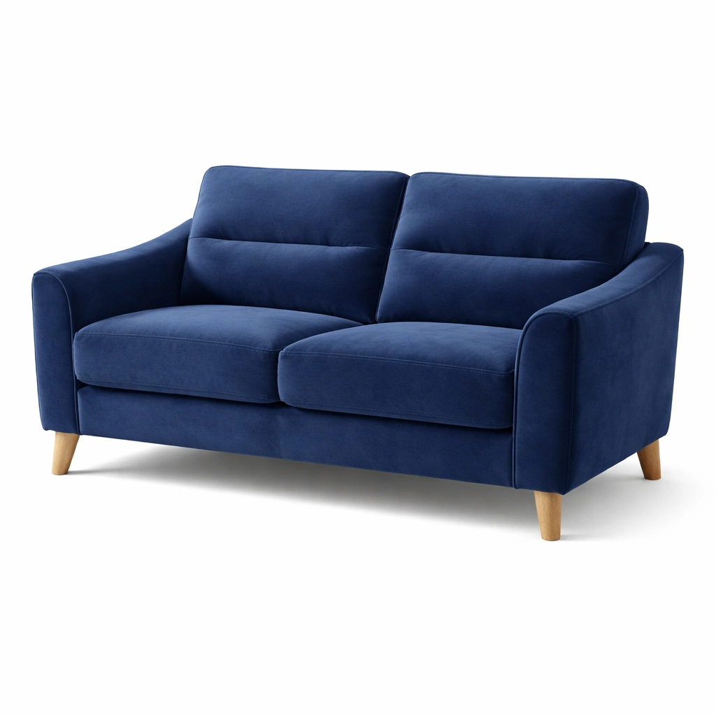 Sofá de dos plazas de terciopelo azul con patas de madera