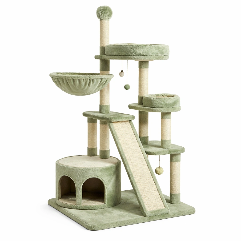 Composición Estructural: Incluye múltiples plataformas, rascadores, hamaca, casa con entrada arqueada y bolas colgantes.