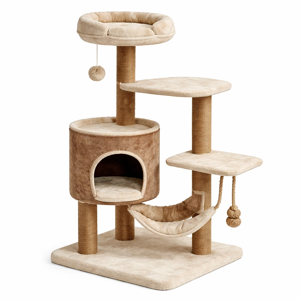 Árbol rascador con múltiples niveles, fabricado de sisal y fibra de poliéster. Incluye cueva, tres plataformas, hamaca y juguete colgante. Altura total de 140 cm y base de 50x50 cm.