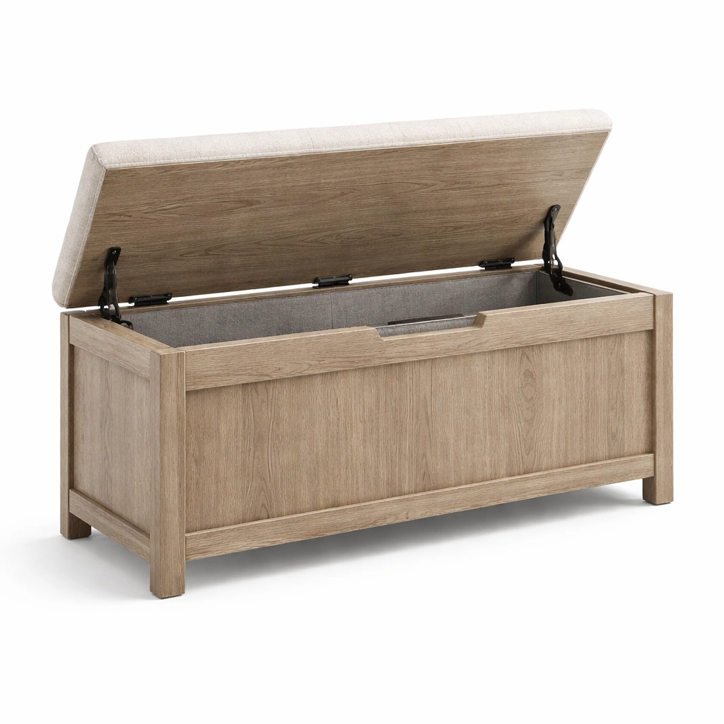 Banco de almacenamiento con estructura de madera de roble y un asiento tapizado en tela de color crema. Sus bisagras metálicas garantizan un mecanismo de apertura seguro. La dimensión total es de 120 cm x 40 cm x 45 cm.